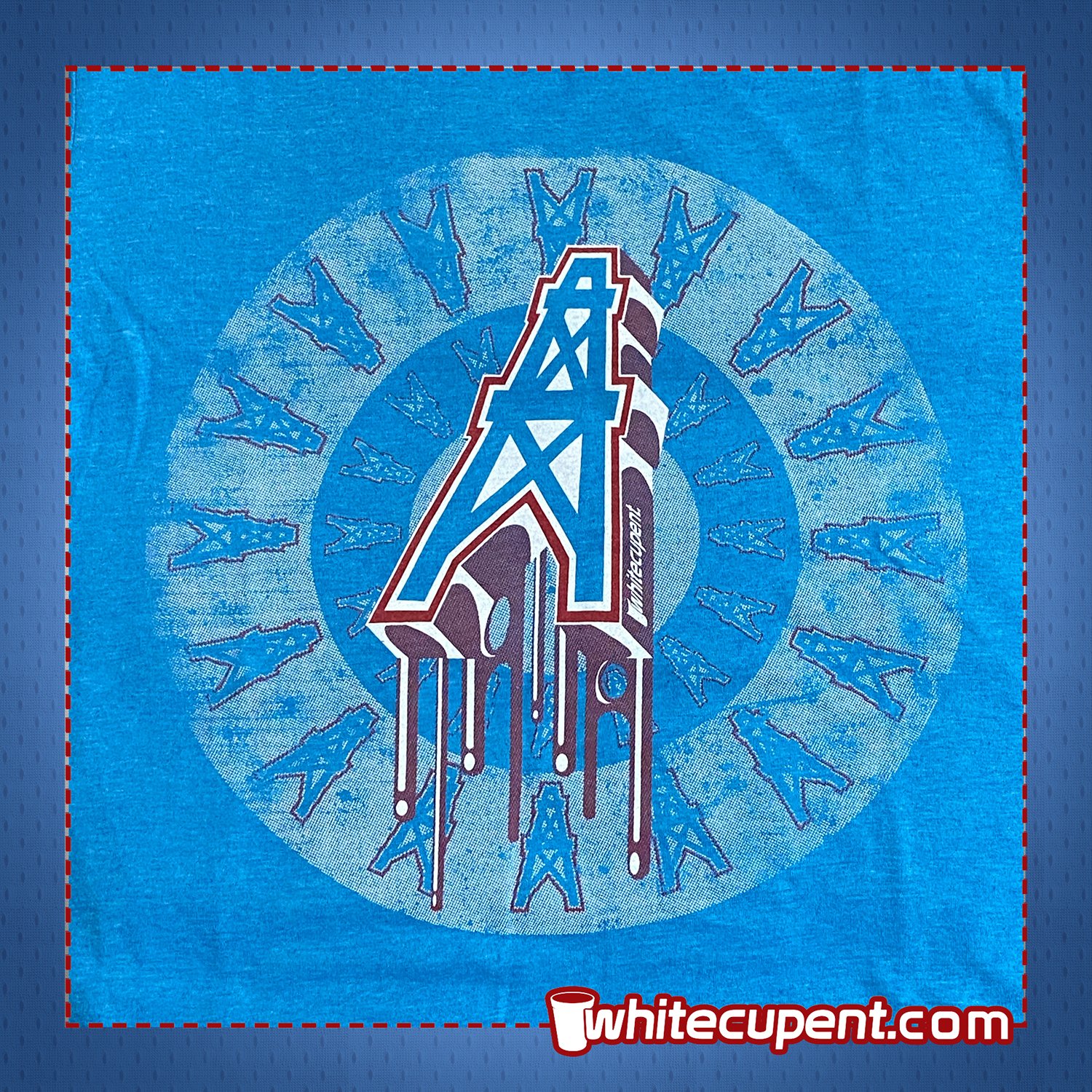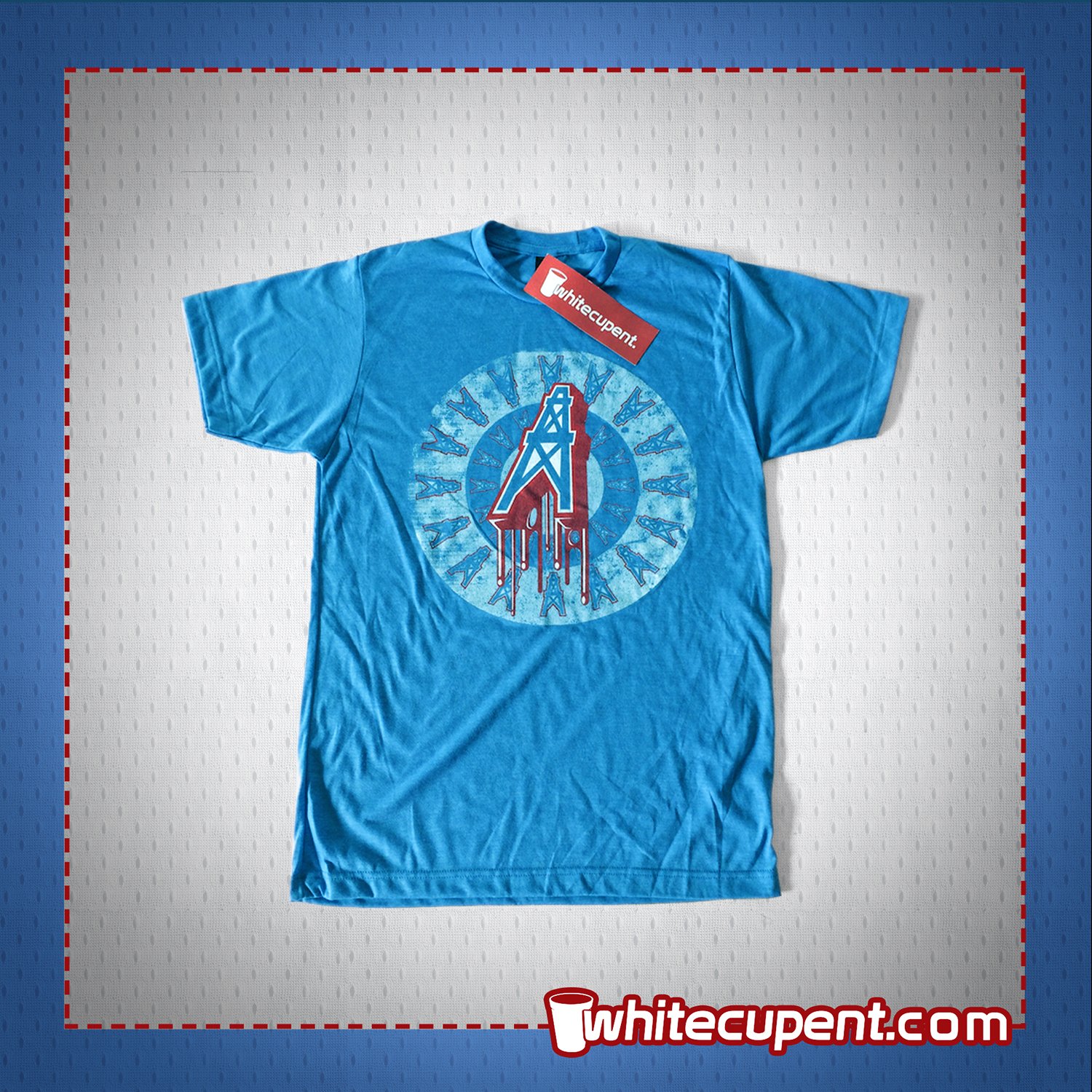 Heather Blue Drippy Oilers screen printed tee. Tribute to a throwback with this iconic Houston Oilers with that White Cup drip.. 2 Color design screen printed on 50/50 blend ringspun heather blue tee.