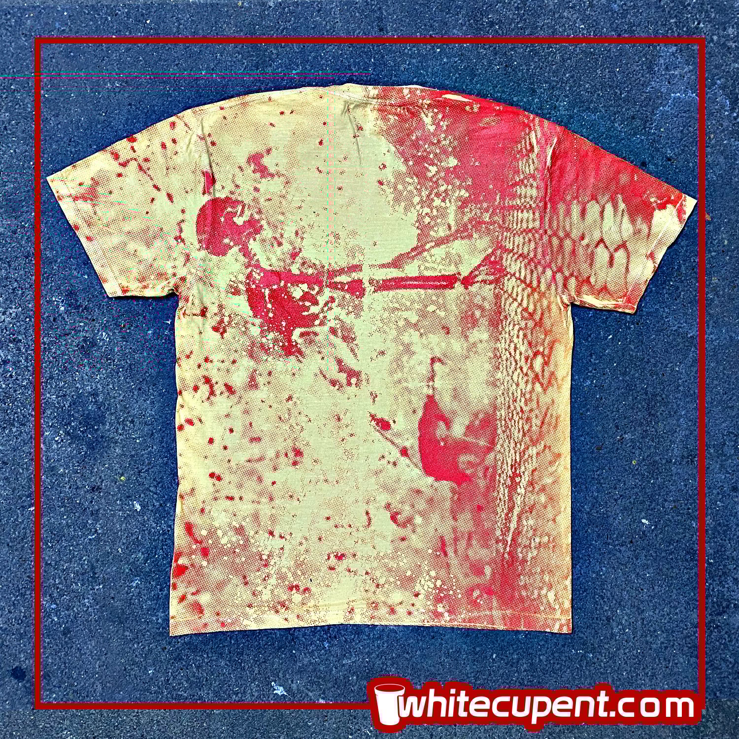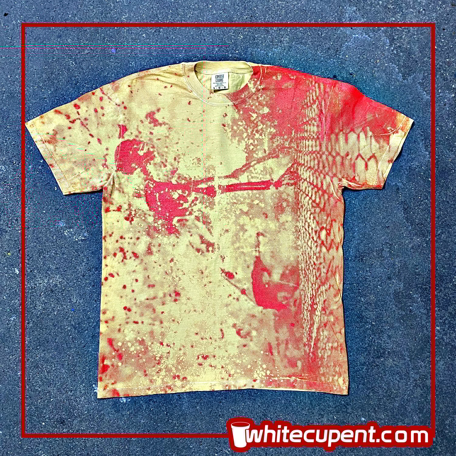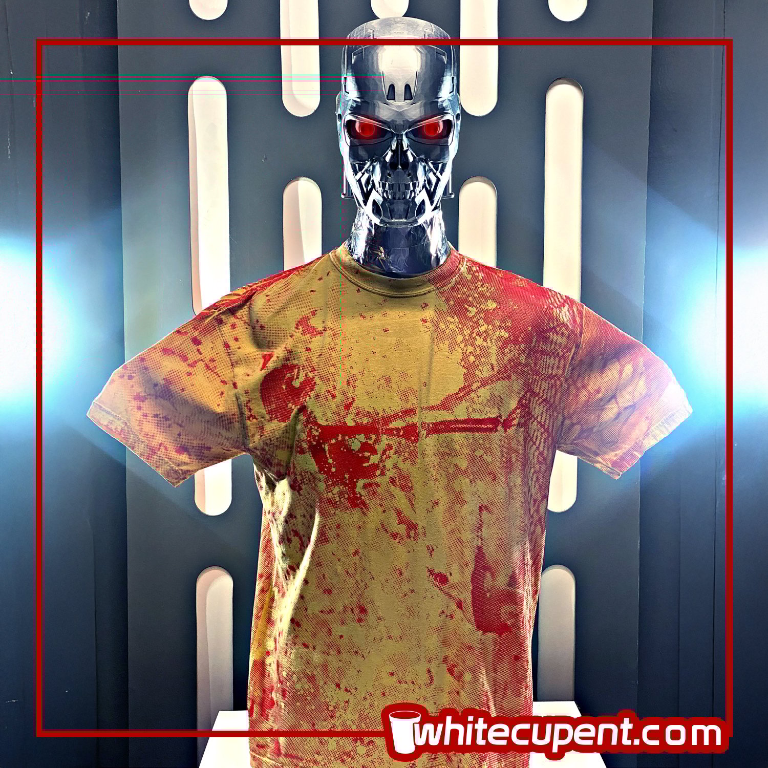 White Cup Ent brings you another All Over Print. This time is arguably one of the most iconic scenes from T2.. JUDGMENT DAY. Full all over screen print design from and back. Red ink on 100% cotton yellow garment dyed Comfort Color tee.