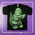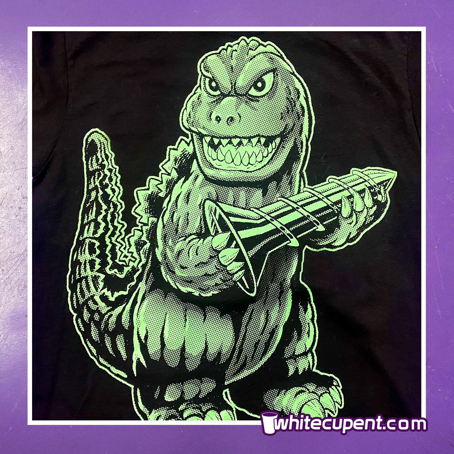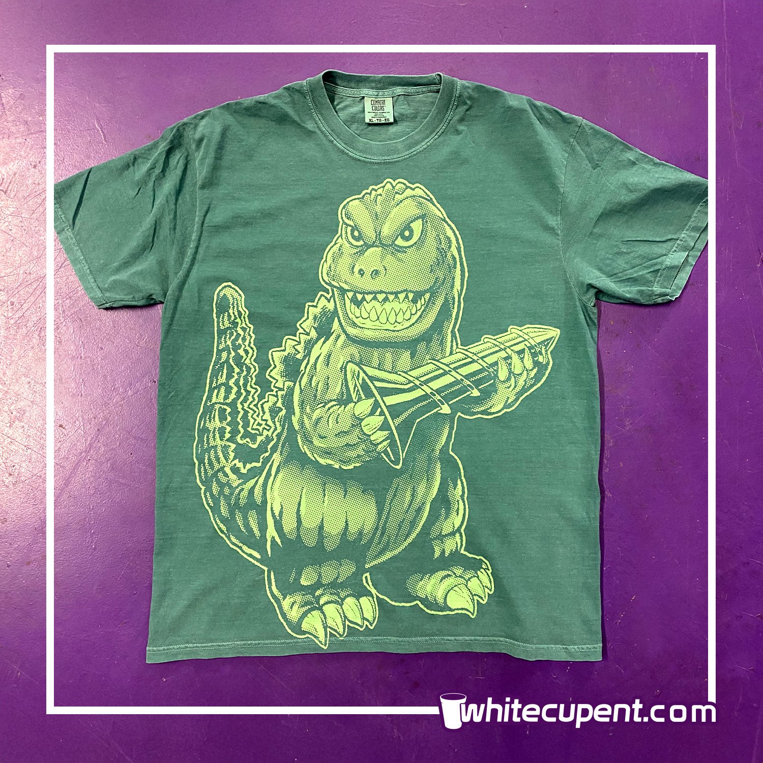 White Cup Ent x TOHO collaboration.. Screwzilla screen printed tee. White Cup's take on the Japan's own Kaiju.. features huge Texas sized 30inch one color Screwzilla screen print on 100% cotton garment dyed black Shaka wear tee or green Comfort Color tee
