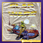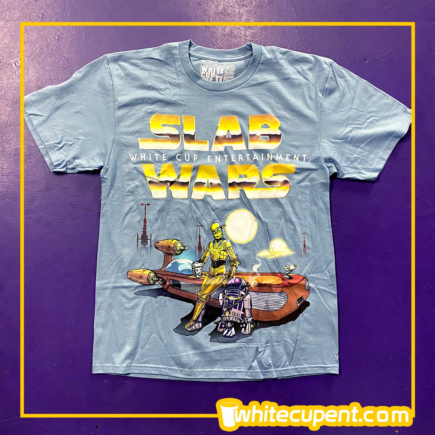 REMASTERED, RESIZED & REISSUED.. White Cup Ent x Star Wars Slab Wars full color screen printed tee. Features all new golden text and a bigger original design of C3P0 & R2D2 chillin on Tatooine on their Slabbed out Landspeeder.. Full Color CMYK design screen printed on 100% ringspun cotton sand, brown or lake colored tee.